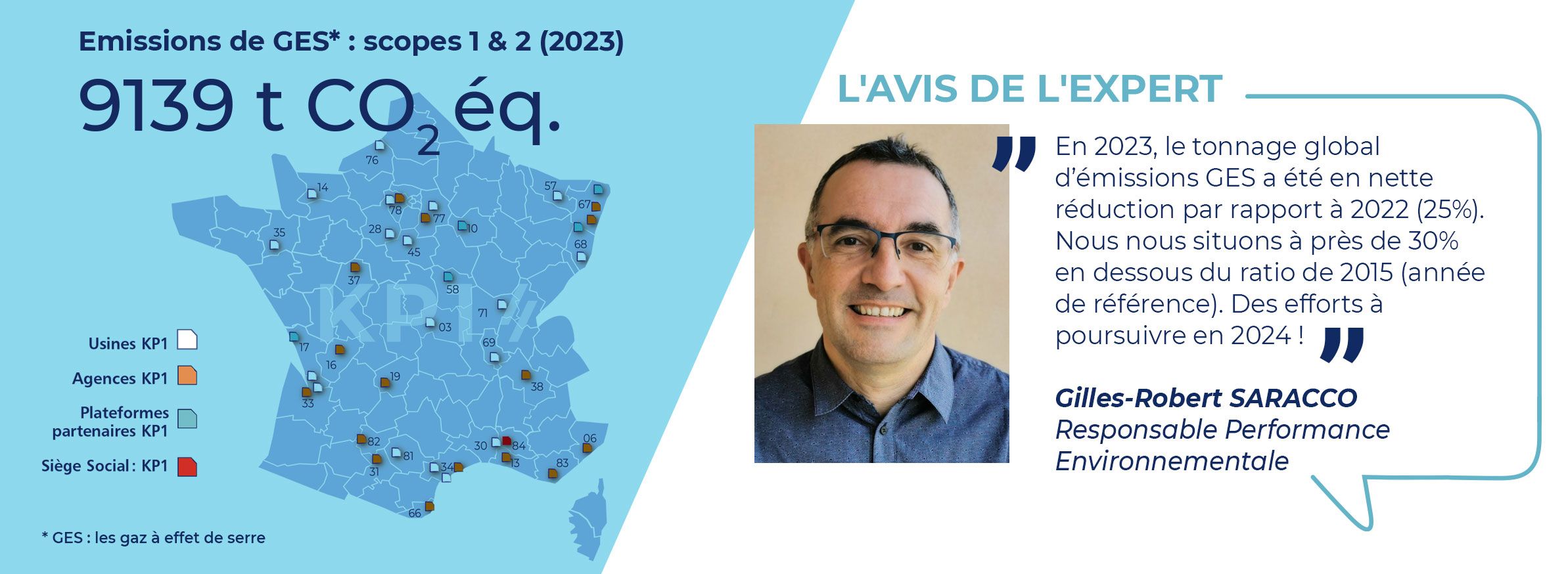 L’accord de Paris sur le Climat, traité international sur le réchauffement climatique, a été ratifié par 55 pays en 2015. La même année, KP1 réalisait une première déclaration à l’ADEME concernant les scopes 1 & 2 du bilan carbone. Dès 2019, nous avons annoncé notre stratégie environnementale : réduire de 50% notre impact carbone à horizon 2031, en comparaison avec les données de base de 2015. Les gains sont analysés sous 3 angles complémentaires qui reflètent notre activité au quotidien : le gain sur nos impacts en usine, le gain sur le poids carbone de nos produits finis et le gain sur les chantiers.